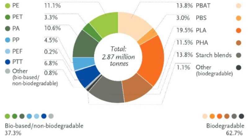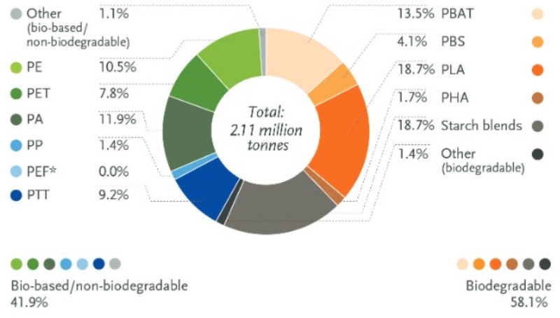 El 58,1% dels materials bioplàstics a més de ser biobasats són biodegradables i els més populars són el PLA i altres productes derivats de les barreges de midó.
