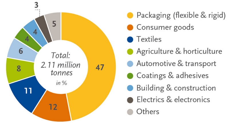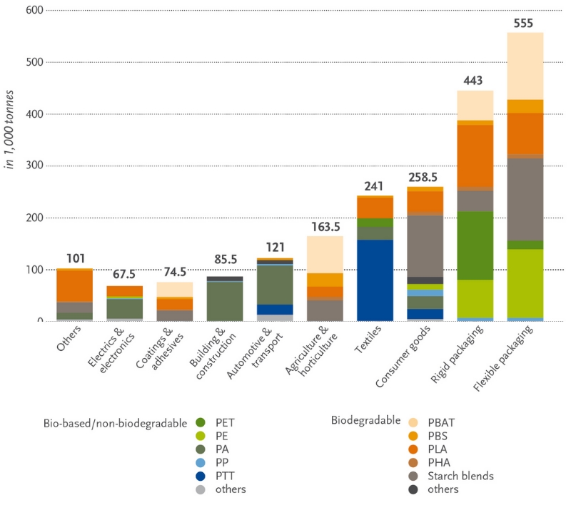 El 47% dels materials bioplàstics que es van fabricar l'any 2020 es van destinar al mercat de l'embalatge flexible i rígid, el 12% a béns de consum i l'11% a la indústria tèxtil.